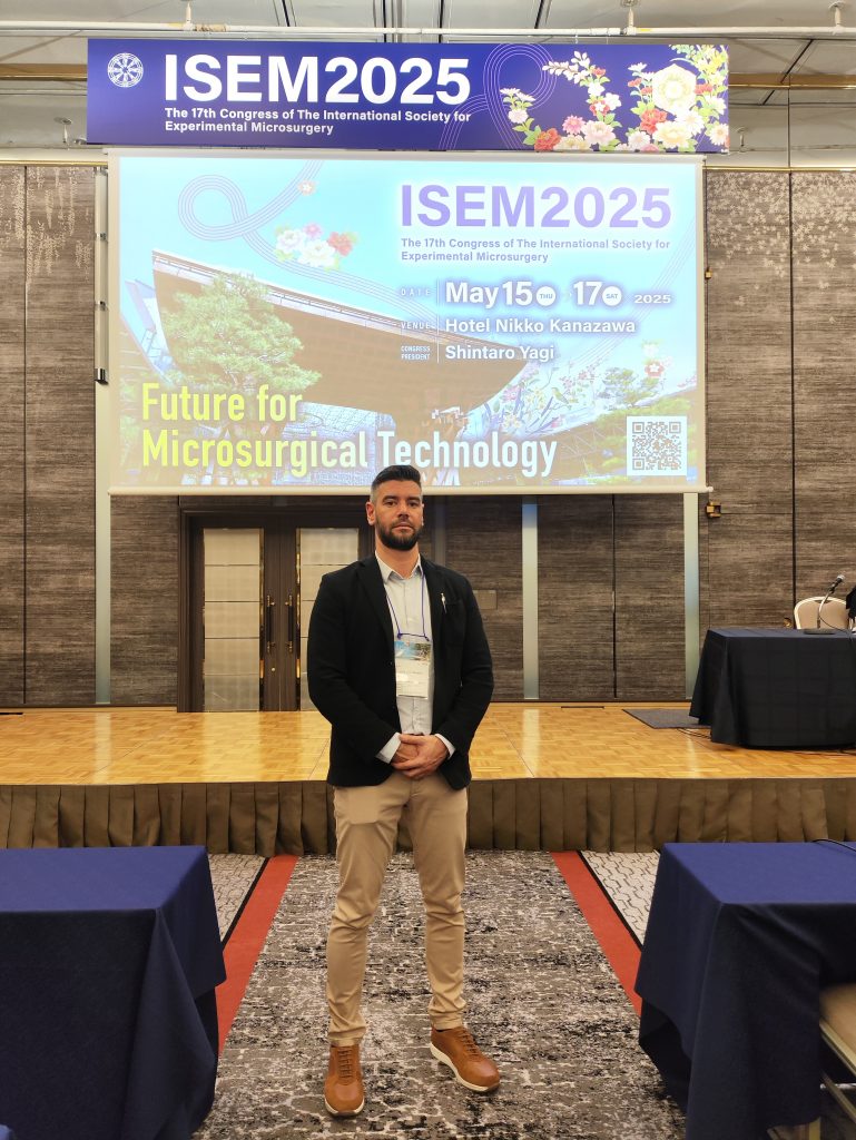 El Dr. Campos presentó la ponencia titulada «Lymphatic Regeneration and Supermicrosurgical Training in a Novel Rabbit Model: Popliteal Node Excision, Collagen Scaffolds and Lymphaticovenous Anastomosis». En ella, expuso los resultados de un estudio pionero que emplea un modelo experimental en conejos para investigar la regeneración linfática tras la escisión del ganglio poplíteo y la implantación de andamiajes de colágeno alineados, conocidos como BioBridge™. Este enfoque innovador no solo busca prevenir y tratar el linfedema secundario, sino que también proporciona una plataforma efectiva para el entrenamiento en técnicas supermicroquirúrgicas, como la anastomosis linfaticovenosa.
