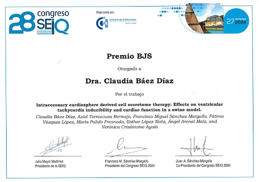 A ellos concurrió la Dra. Claudia Báez, investigadora miembro del Centro de Investigación Biomédica en Red de Enfermedades Cardiovasculares (CIBER-CV) que fue premiada por el trabajo “Terapia intracoronaria mediante secretoma de células derivadas de cadiosferas post-infarto: Efectos sobre la inducibilidad de taquicardia ventricular y la función cardiaca en modelo porcino” de los autores Claudia Báez, Axiel Torrescusa, FM Sánchez, Fátima Vázquez, María Pulido, Esther López, Ángel Arenal y Verónica Crisóstomo.