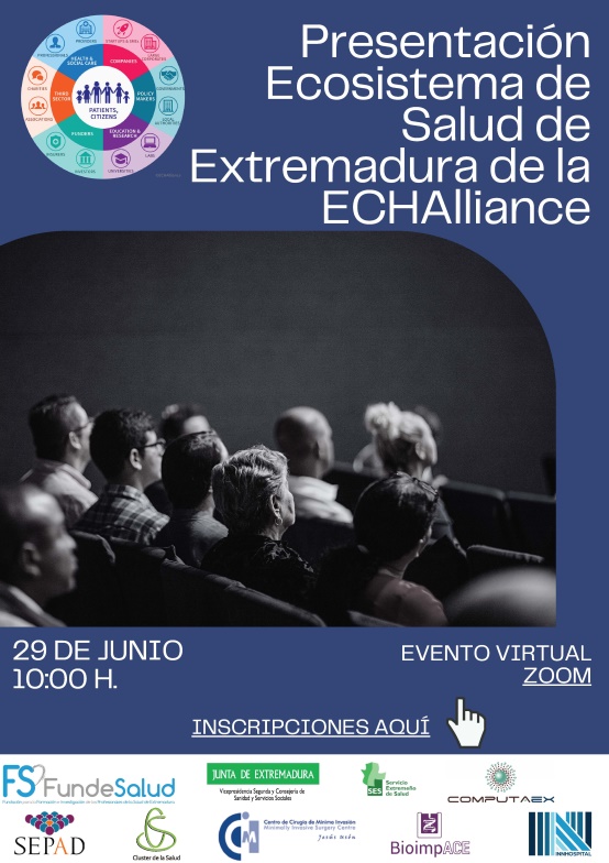 El próximo día 29 de junio se celebrará de forma virtual la presentación institucional del Ecosistema de Salud de Extremadura de la ECHAlliance. Será inaugurada por el Excmo. Sr. D. José María Vergeles Blanca, Vicepresidente Segundo y Consejero de Sanidad y Servicios Sociales, posteriormente se explicará el ecosistema de la región en materia de salud y seguidamente, dos proyectos innovadores: INNHOSPITAL y BIOIMPACE.